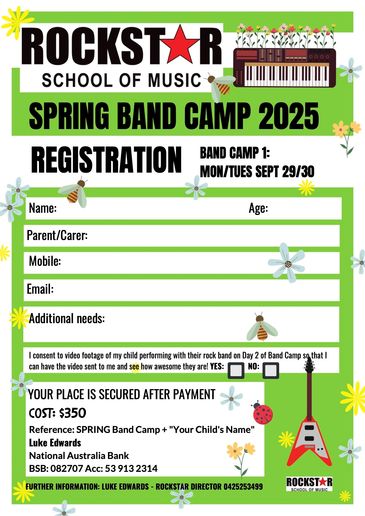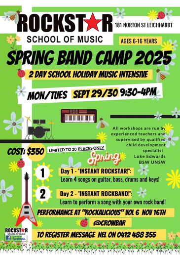 Calling all band campers! Whether you are an experienced young rockstar or completely new to music, everyone 6 to 16 is welcome to join band camp for a 2 day school holiday music intensive.